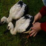 En dan, eindelijk, na 10 weken durven de jongen de grote stap te nemen en uit te vliegen. Hier staat een jong in het weiland. Ze hebben nog een zwarte snavel en donkere poten. Pas als ze geslachtsrijp zijn komt de oranje kleur.